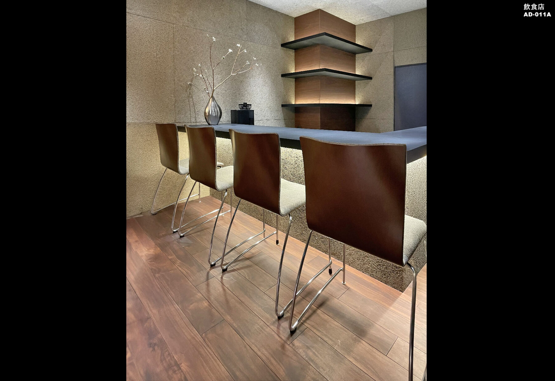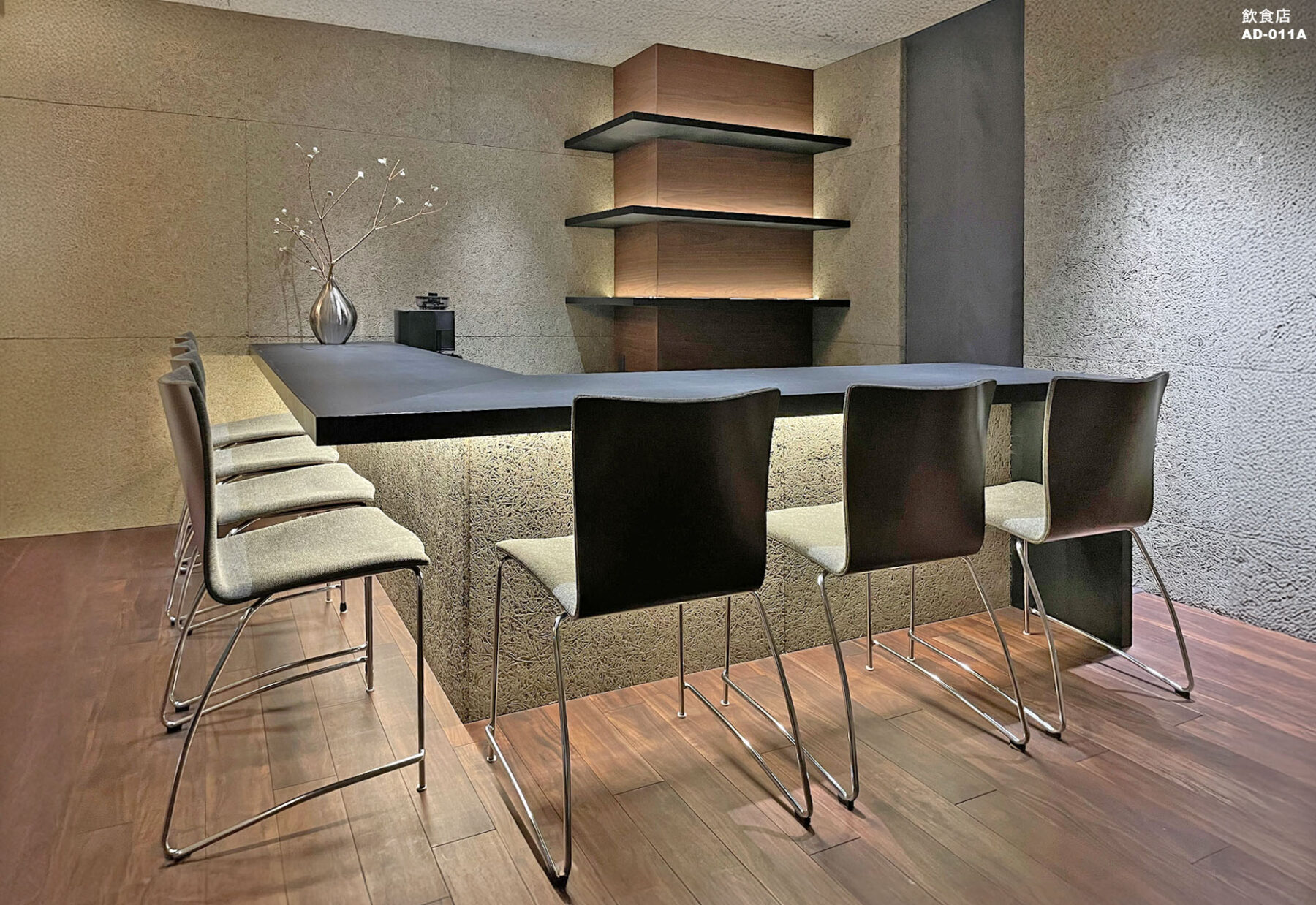 納入後の感想:背座の木と脚部のスチールフレームが美しく、 並べても空間を重たくさせず、全体に軽やかな印象を与えることが出来ました。