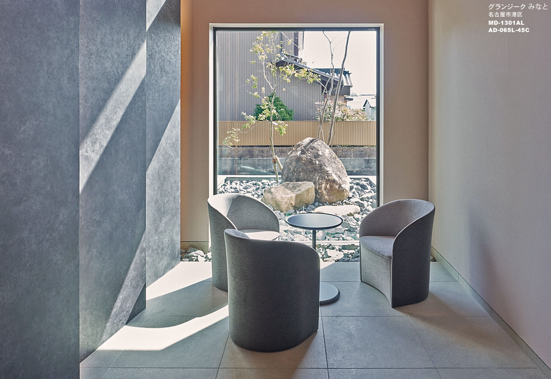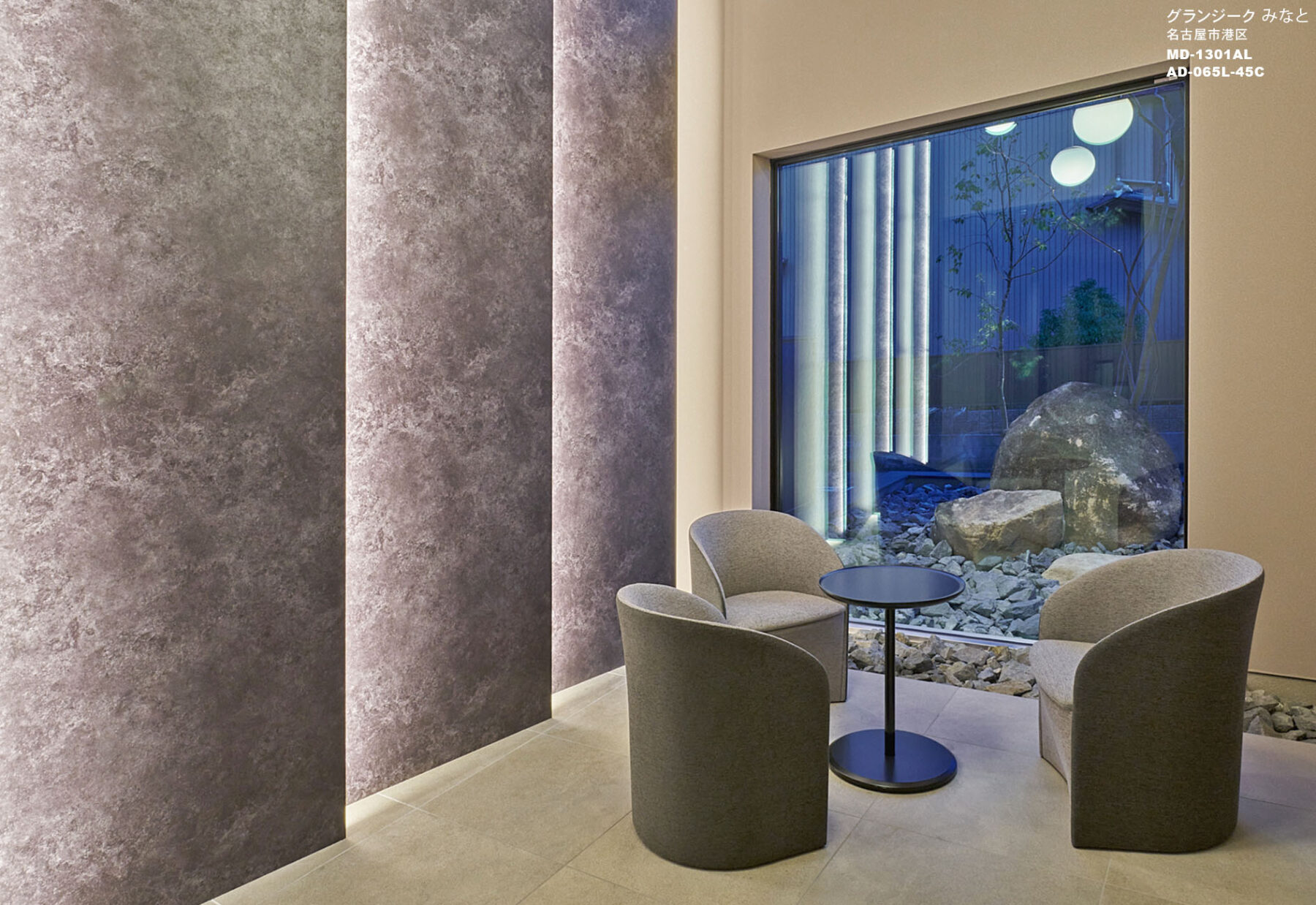 納入後の感想:どの角度から見ても美しいエントランス空間となりました。MD-1301ラウンジチェアが上質なラウンジ空間演出の一役を担ってくれています。