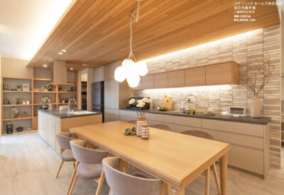 木のぬくもり感のあるホワイトオークの色調の空間に、グレージュ系のインテリアで、柔らかい空間を演出。