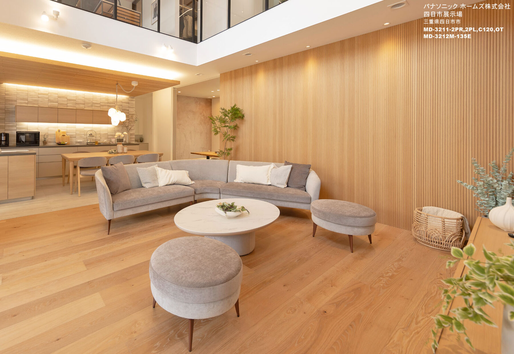 当社製品の採用理由:壁面に縦ラインを強調する木調リブを用いているので、家具は曲線のもので、エレガントな雰囲気を出せるように、弓型のソファ、楕円のテーブルを選定しました。弓型ソファは大人数が座れて、空間にもゆとりが出るので、ゆったりとしたリビングが演出できたと思います。