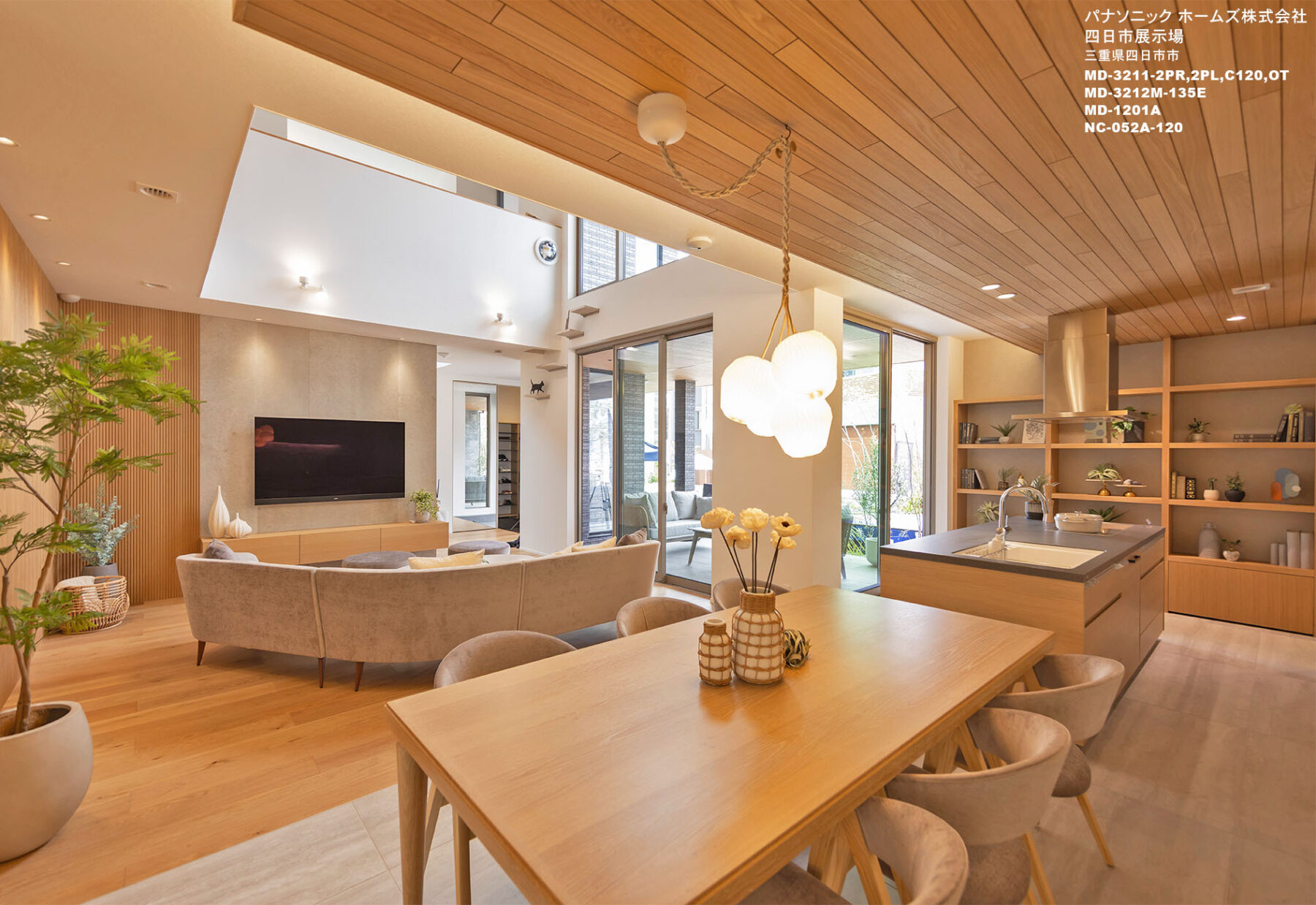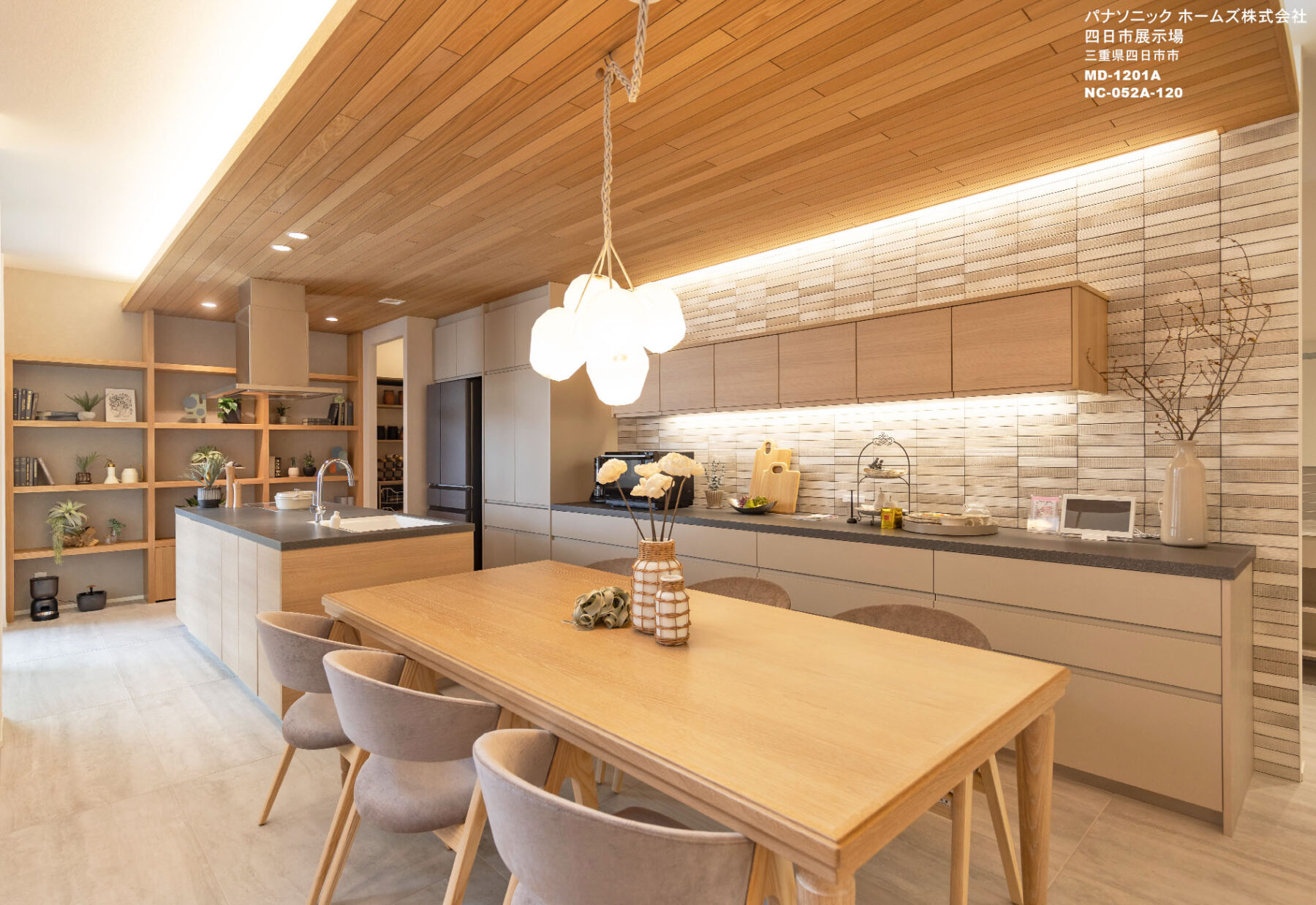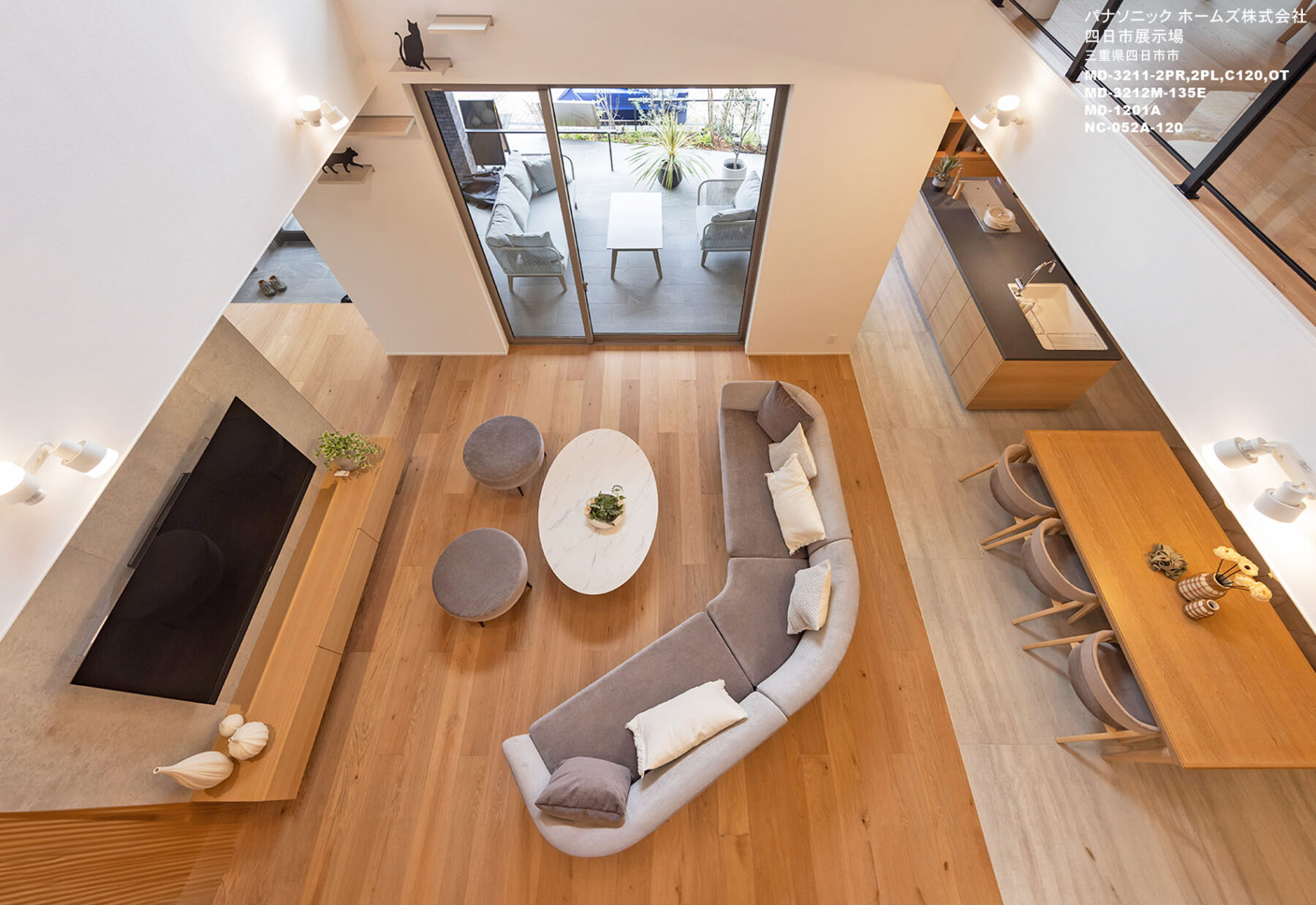 木のぬくもり感のあるホワイトオークの色調の空間に、グレージュ系のインテリアで、柔らかい空間を演出。