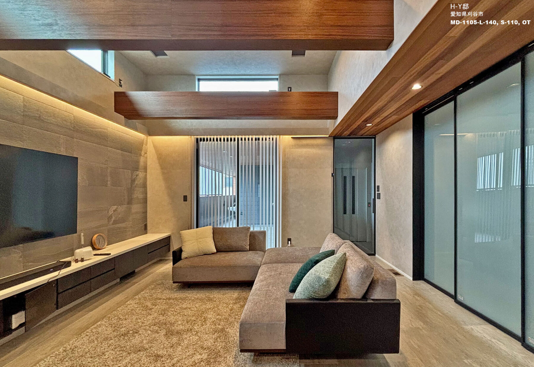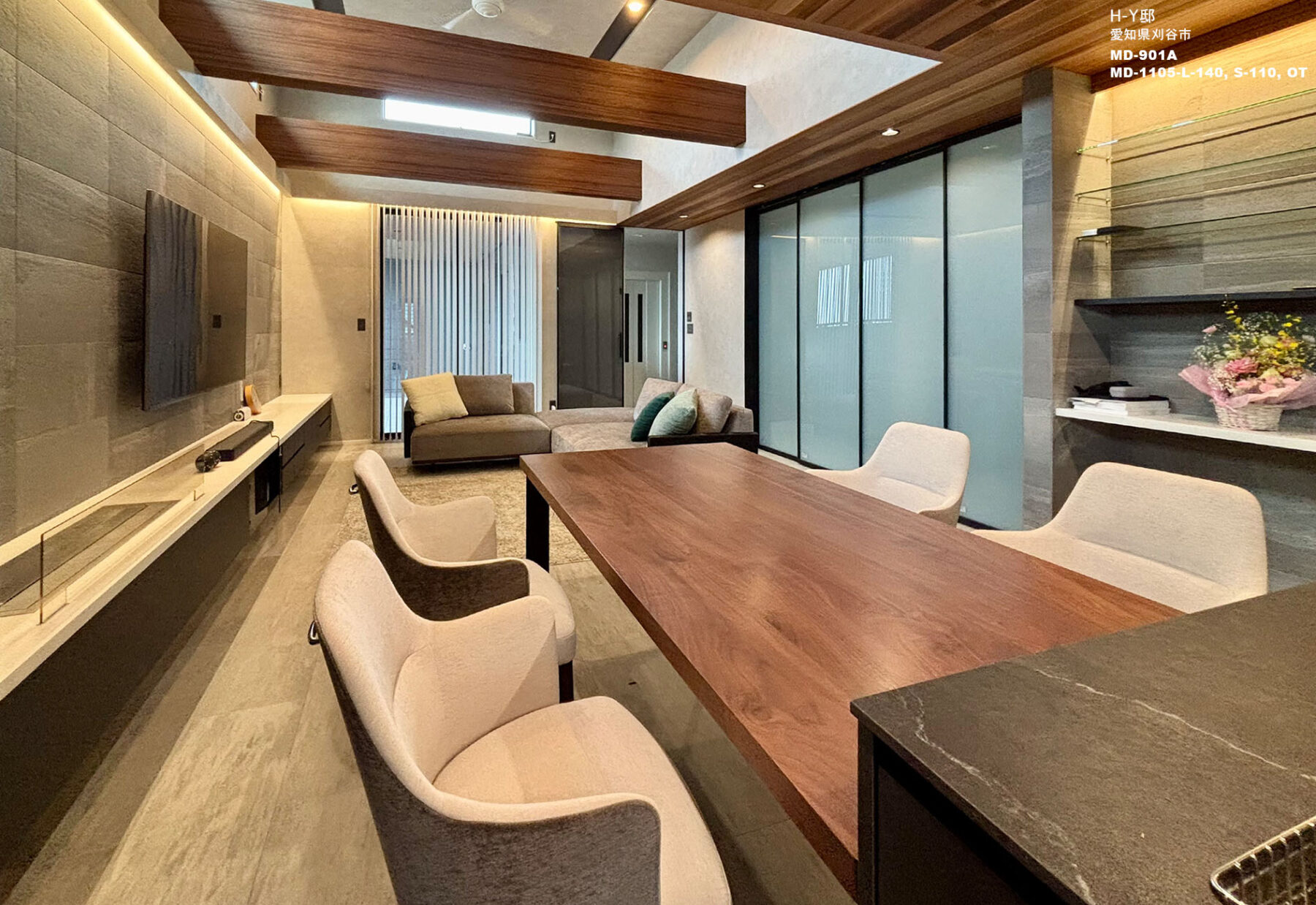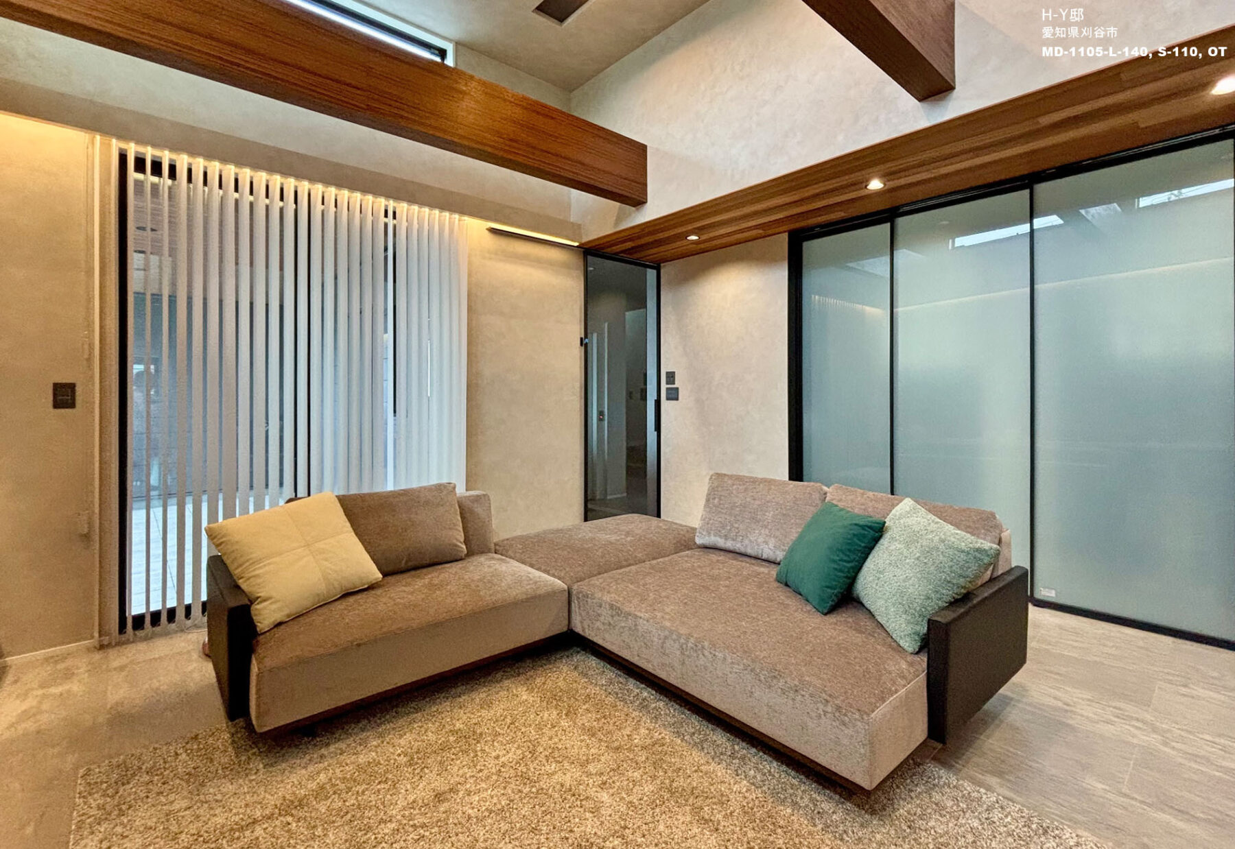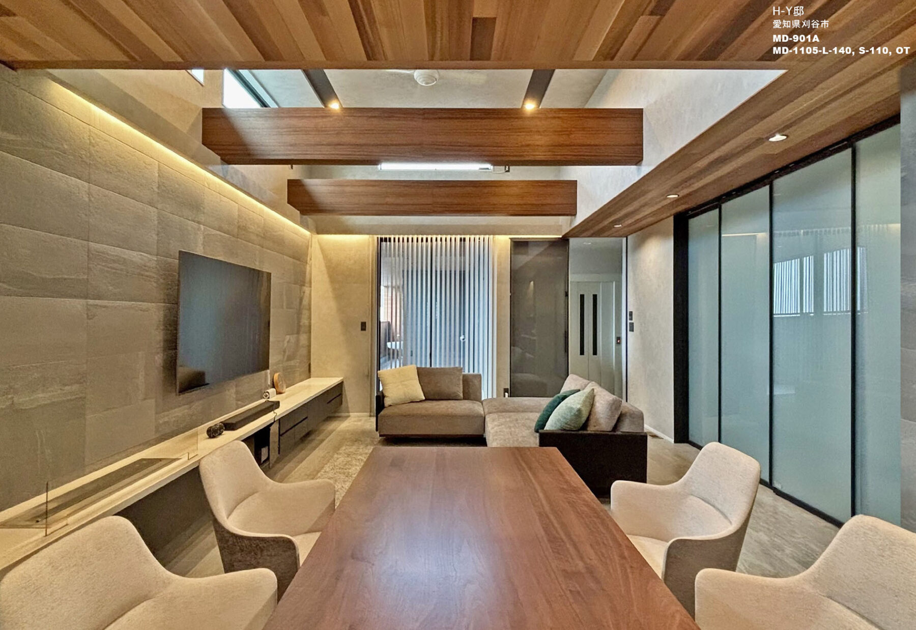 当社製品の採用理由:モダンな空間に似合う、上質で個性的な家具メーカーとしてお客様にご提案しました。小さなお子様がいらっしゃるご家庭ですが、機能・デザイン性共に高い張地があるとのことで安心してファブリックのソファ・チェアをご提案できました。