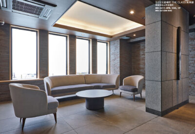 当社製品の採用理由:アームと背の柔らかい曲線が特徴のコーナーソファーを配置。同シリーズのラウンジチェアと共に座面にアクセント色を用い、より優美さが感じられる