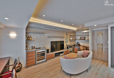部屋を大きく取るためにスクエアな空間とし、家具の優しい丸みを取り入れ、くつろげるリビングを作りました。