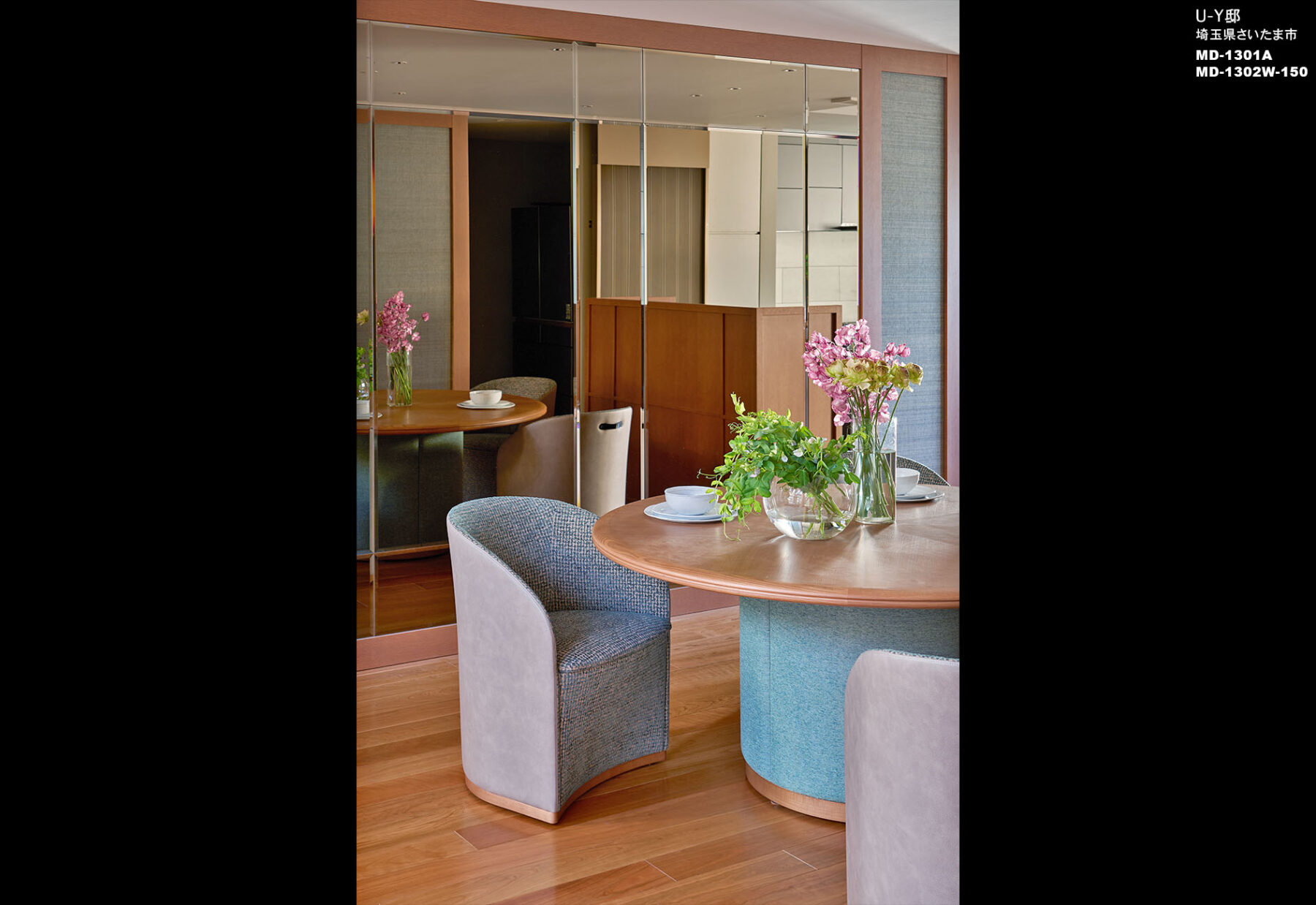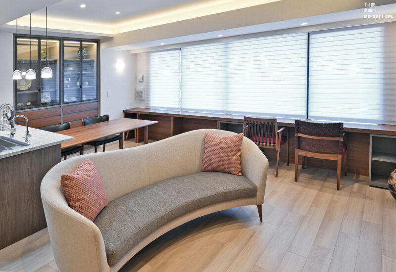 お施主様がこだわられてた天然のチェリーのフローリングがいきるようにベース壁は織物グレージュの壁で仕上げ大判タイル、ミラー、ブラックキッチン、グリーンの張地を混ぜ、落ち着きのある夜をいっそう楽しめる空間に仕上げました。所々に残る既存梁や柱が気にならないように、縦方向に空間を繋げ、外部の緑が室内でも取込めるように、ダイニングエリアに大きくミラーを設置しています。