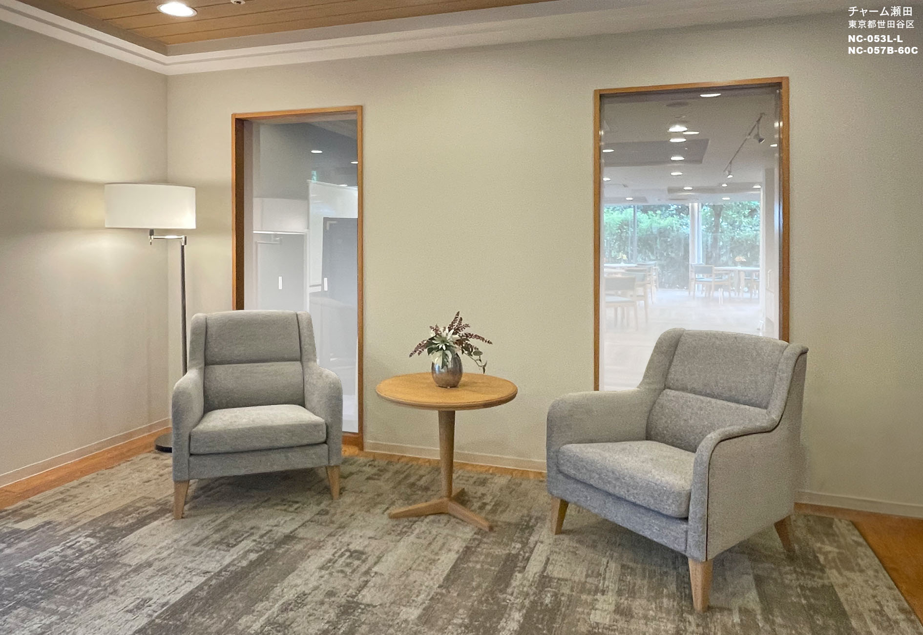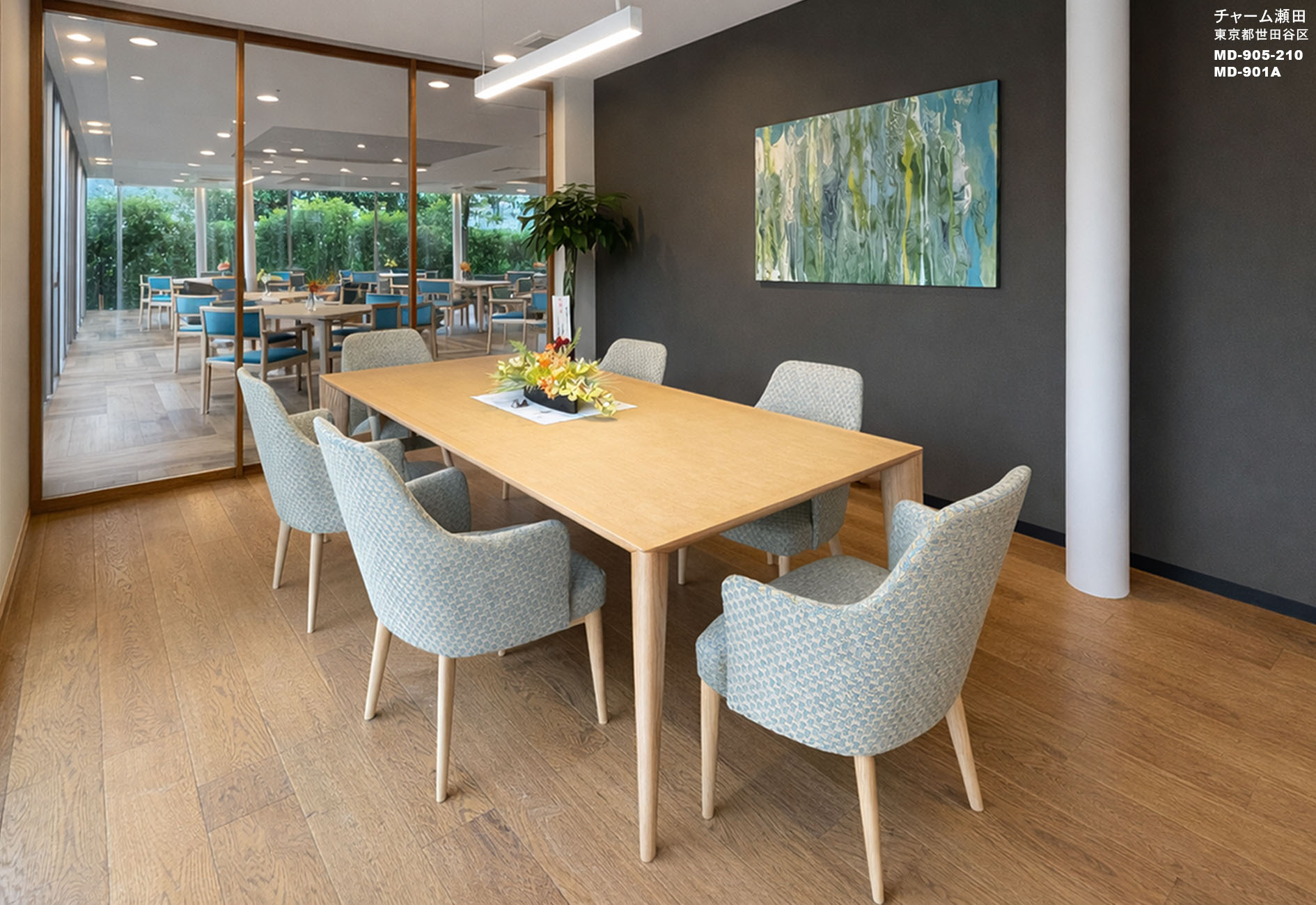 木目調の床や天井が、空間に豊かな光を取り込み、自然なぬくもりを落ちつきを感じさせる 建物本来の魅力を大切にしながら計画しました。内装の雰囲気を損なわないことを重視し、家具や素材は空間全体と穏やかに調和する構成としています。 デザインは過度な主張を避けつつ、上質感と優しさを兼ね備えた表情とすることで、ご入居者様が日々安らげる住環境となることを意識してコーディネートしました。
